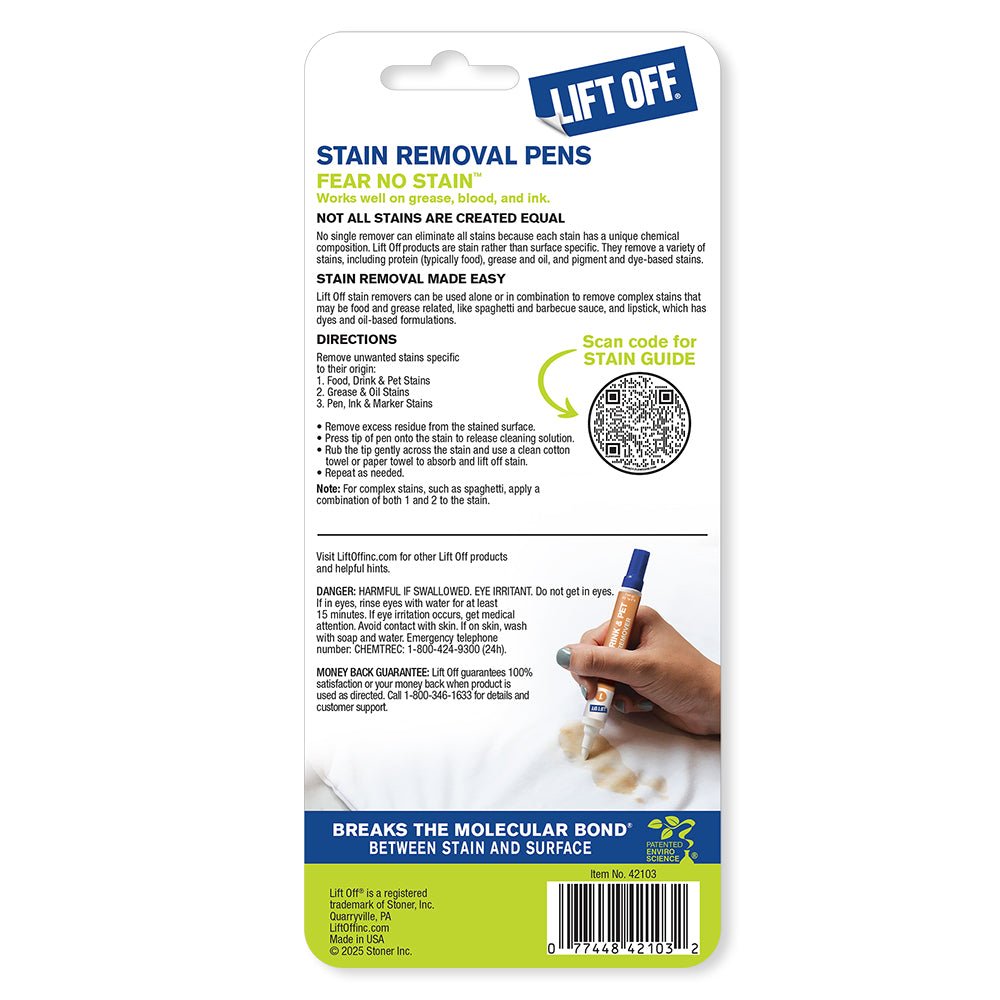 Meet the Lift Off Stain Removal Pens, a compact trio of stain-fighting pens made for life’s little messes. Whether you’re out and about, driving to an important meeting, or just need a quick fix at home, this kit is perfect for tackling small, everyday stains. Each pen is specially formulated to target a specific type of stain, because not all stains are created equal. From grease to ink to protein-based spills, this set has you covered. Fear no stain™ with the power of Lift Off’s stain-specific formulas that work with, not against, the surfaces you’re cleaning.