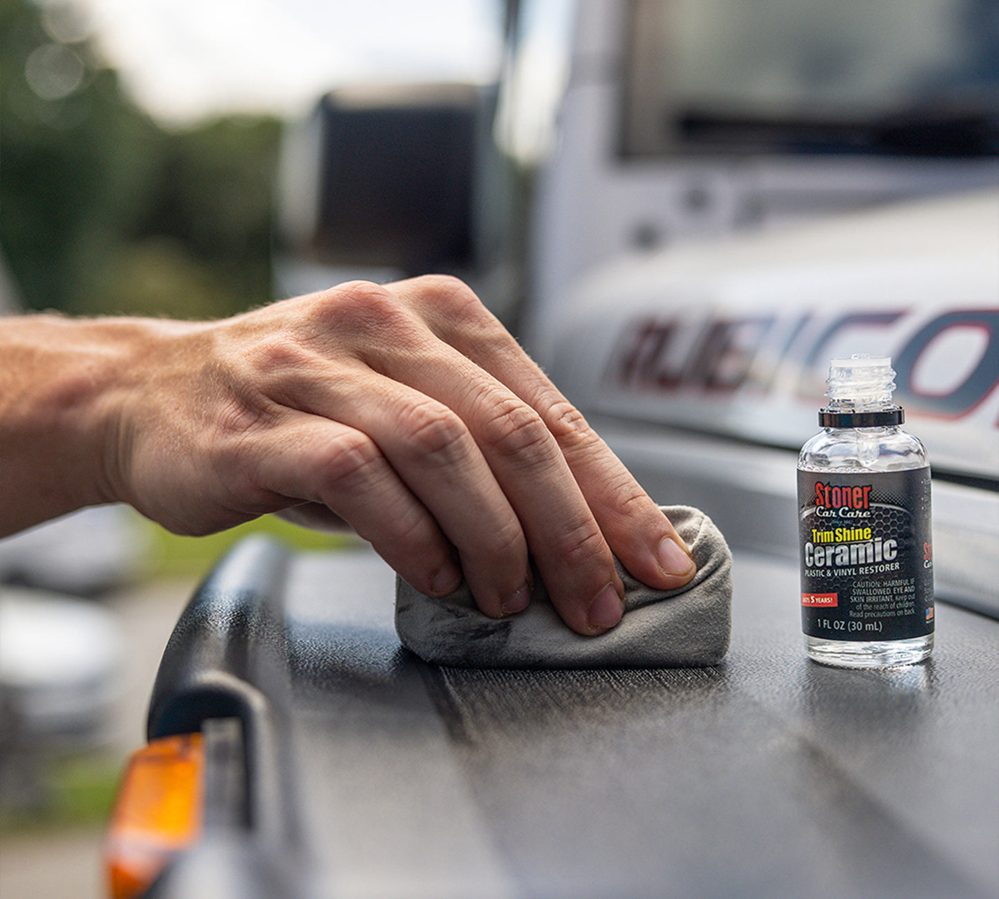 Professional grade, hard ceramic coating acts like a clearcoat for your trim.