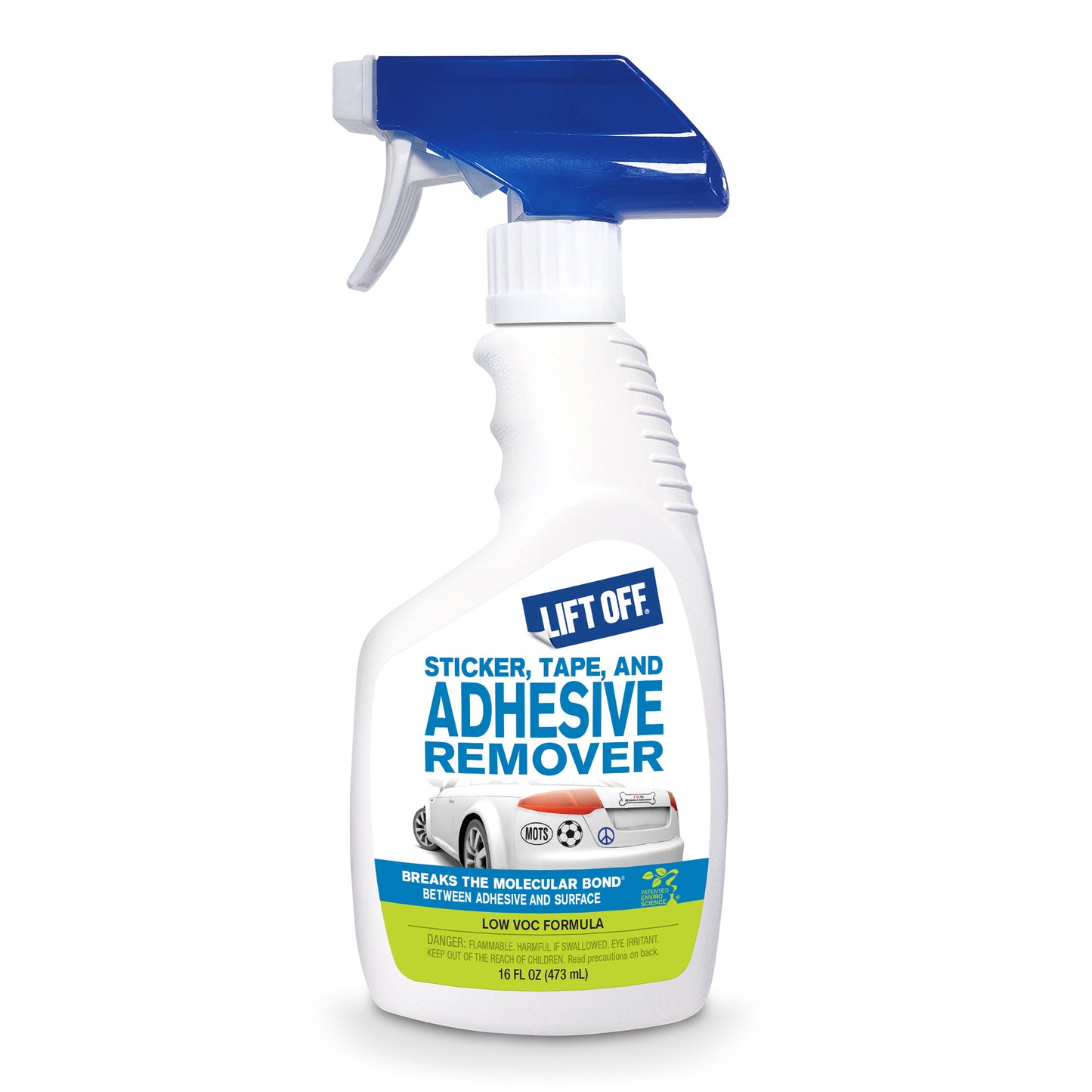 The patented formula of Motsenbocker’s Lift Off® Breaks the Molecular Bond™ for fast and easy removal of painter’s tape, duct tape, mounting tape, weather stripping tape, spray adhesives, stickers, labels, chewing gum, sticky residues, wax, and glue from hard surfaces.